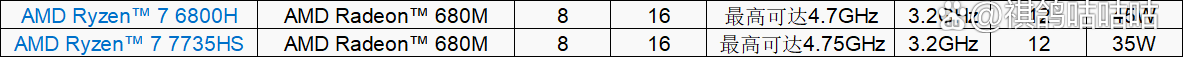 从官方的数据来看这俩差距很小很小,基本一致,7735HS比6800H多了0.05GHz的频率,功率比6800H低了10W,说7735HS是6800H的马甲我觉得也不过分。